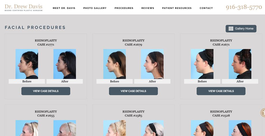 Take a look at the Ultimate Before & After Gallery installed on several cosmetic plastic surgery websites. Keep in mind that the gallery is also great for home renovation/remodelers, automotive detailing shops, medical spas, dentists, or any other business that achieves highly visible results for its customers!
